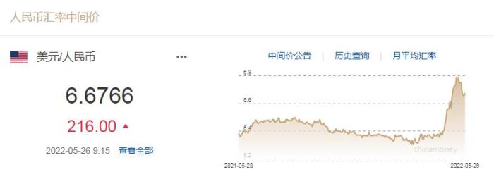 中新財(cái)經(jīng)5月26日電 中國(guó)人民銀行授權(quán)中國(guó)外匯交易中心公布,2022年5月26日銀行間外匯市場(chǎng)人民幣匯率中間價(jià)為:1美元對(duì)人民幣6.6766元。這較上一交易日下調(diào)216個(gè)基點(diǎn)。(完)