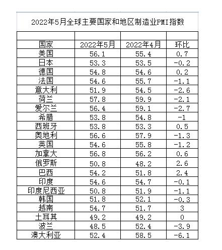 中國(guó)物流與采購(gòu)聯(lián)合會(huì)網(wǎng)站發(fā)布的2022年5月份全球主要國(guó)家制造業(yè)PMI指數(shù)截圖。