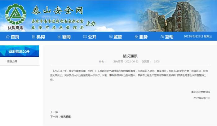 中新網(wǎng)6月22日電 據(jù)山東省泰安市應(yīng)急管理局網(wǎng)站消息,山東泰安市應(yīng)急管理局21日發(fā)布通報,6月21日上午,泰安市綠地公館一層的一門頭房因液化氣罐泄漏引發(fā)的爆炸事故,共造成13人受傷。截至目前,共有3人因受傷嚴(yán)重、傷情惡化,經(jīng)搶救無效死亡。其余受傷人員正在接受進(jìn)一步治療。