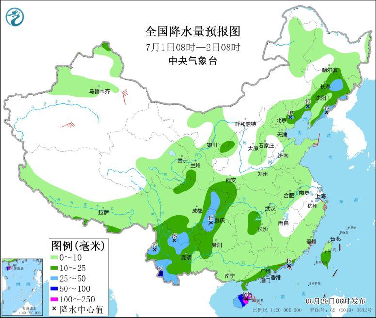 圖2全國(guó)降水量預(yù)報(bào)圖(6月29日08時(shí)-30日08時(shí))