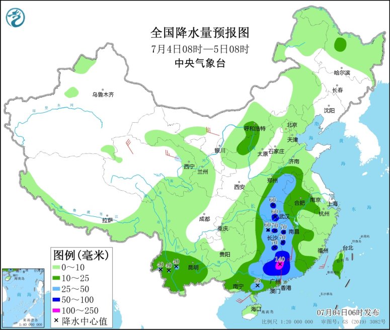 7月4日08時(shí)至5日08時(shí),廣東大部、廣西東部、湖南中東部、江西西部和南部、湖北中部、河南東部等地部分地區(qū)有大到暴雨,其中,廣東北部等地部分地區(qū)有大暴雨(100~140毫米)。內(nèi)蒙古西部、甘肅西部、青海北部、東北地區(qū)南部、江南中部、華南東部等地的部分地區(qū)有4~6級風(fēng);東海北部海域有6~7級、陣風(fēng)8級的旋轉(zhuǎn)風(fēng),東海南部海域、臺灣海峽、北部灣、南海北部和中部海域有5~6級、陣風(fēng)7級的偏南到西南風(fēng)。