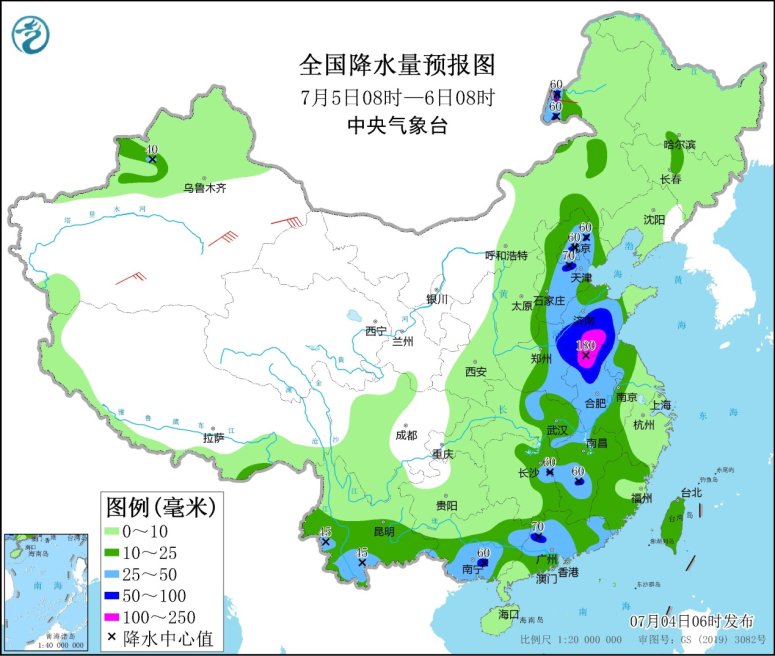 7月5日08時(shí)至6日08時(shí),內(nèi)蒙古中東部、京津冀、黃淮中東部、西南地區(qū)南部、江淮大部、江漢東部、江南中東部、華南大部、臺灣島等地的部分地區(qū)有中到大雨,其中,山東中南部、河南東部、安徽北部、江蘇北部、京津冀、廣東北部等地的部分地區(qū)有暴雨,山東南部、安徽北部、江蘇北部、河南東部等地局地大暴雨(100~180毫米)。新疆北部和東部、內(nèi)蒙古西部、甘肅西部、東北地區(qū)南部、山東半島、江南東部等地的部分地區(qū)有4~6級風(fēng),其中,新疆東部、浙江東部等地的部分地區(qū)風(fēng)力可達(dá)7級以上;東海大部海域、臺灣海峽、北部灣有5~6級、陣風(fēng)7級的偏南到西南風(fēng)。