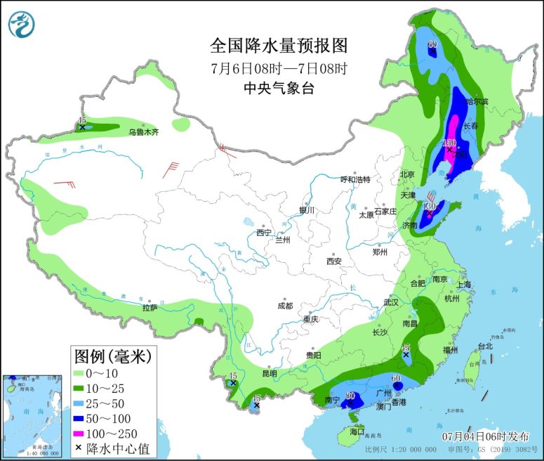 7月6日08時(shí)至7日08時(shí),內(nèi)蒙古東部、黑龍西南部、吉林中西部、遼寧大部、河北東北部、山東、江南東部、華南大部、云南南部等地的部分地區(qū)有中到大雨,其中,遼寧大部、吉林西部、黑龍江西南部、山東中北部、廣西東南部、廣東中部和西南部等地的部分地區(qū)有暴雨或大暴雨(100~150毫米)。新疆東部和南疆盆地、內(nèi)蒙古中西部、甘肅西部、東北地區(qū)中南部、山東半島、江南東部等地的部分地區(qū)有4~6級風(fēng),其中,新疆東部、浙江東部等地的部分地區(qū)風(fēng)力可達(dá)7級以上;渤海有5~7級、陣風(fēng)8級的偏北風(fēng),渤海海峽、黃海北部海域有6~7級、陣風(fēng)8級的東南風(fēng)轉(zhuǎn)偏南風(fēng),黃海中部和南部海域、東海大部海域有5~6級、陣風(fēng)7級的偏南到西南風(fēng)。