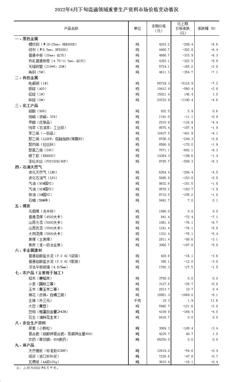 中新網(wǎng)7月4日電 國家統(tǒng)計局網(wǎng)站4日公布2022年6月下旬流通領域重要生產(chǎn)資料市場價格變動情況。據(jù)對全國流通領域9大類50種重要生產(chǎn)資料市場價格的監(jiān)測顯示,2022年6月下旬與6月中旬相比,6種產(chǎn)品價格上漲,40種下降,4種持平。其中,生豬(外三元)價格報18.3元/千克,環(huán)比上漲11.6%。(中新財經(jīng))