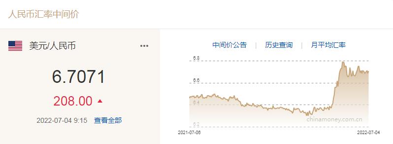 中新網(wǎng)7月4日電 中國(guó)人民銀行授權(quán)中國(guó)外匯交易中心公布,2022年7月4日銀行間外匯市場(chǎng)人民幣匯率中間價(jià)為1美元對(duì)人民幣6.7071元。這較上一交易日下調(diào)208個(gè)基點(diǎn)。(中新財(cái)經(jīng))