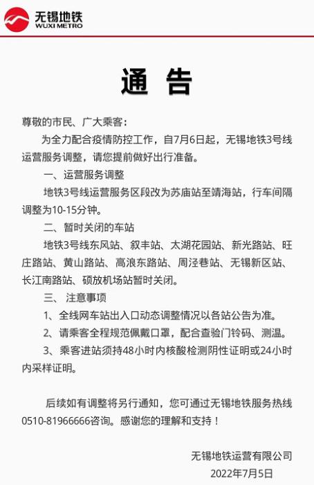 地鐵3號(hào)線東風(fēng)站、敘豐站、太湖花園站、新光路站、旺莊路站、黃山路站、高浪東路站、周涇巷站、無錫新區(qū)站、長(zhǎng)江南路站、碩放機(jī)場(chǎng)站暫時(shí)關(guān)閉。