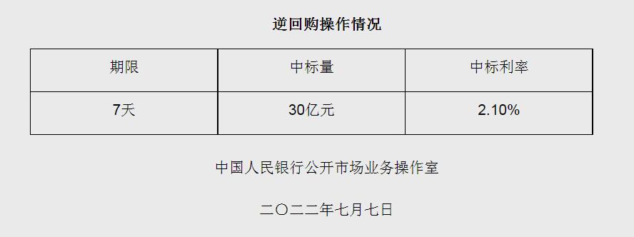 央行7月7日開展30億元逆回購操作 中標(biāo)利率2.10%