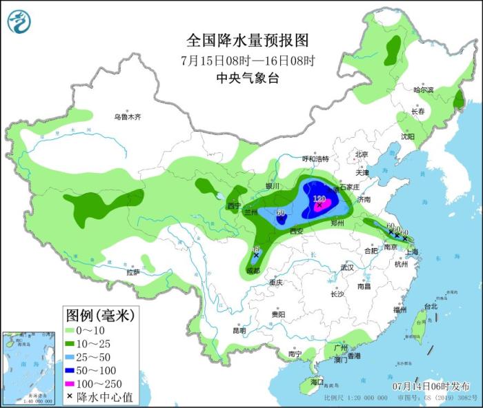 預(yù)計(jì),7月14日08時(shí)至15日08時(shí),西北地區(qū)東部、江蘇北部、安徽北部等地部分地區(qū)有大到暴雨,其中,甘肅東部、陜西北部等地局地有大暴雨(100~120毫米)。上述部分地區(qū)伴有短時(shí)強(qiáng)降水(最大小時(shí)降雨量20~50毫米,局地可超過(guò)60毫米),局地有雷暴大風(fēng)等強(qiáng)對(duì)流天氣。中央氣象臺(tái)7月14日06時(shí)發(fā)布暴雨藍(lán)色預(yù)警。