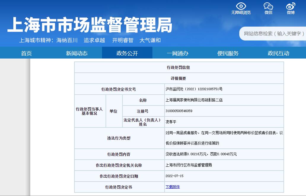 中新網(wǎng)7月27日電 上海市市場(chǎng)監(jiān)督管理局網(wǎng)站顯示,近日,上海福滿家便利有限公司疏影路二店,因?qū)ν簧唐坊蛘叻?wù),在同一交易場(chǎng)所同時(shí)使用兩種標(biāo)價(jià)簽或者價(jià)目表,以低價(jià)招徠顧客并以高價(jià)進(jìn)行結(jié)算,被上海市閔行區(qū)市場(chǎng)監(jiān)督管理局沒(méi)收違法所得21.6元、罰款64.8元。