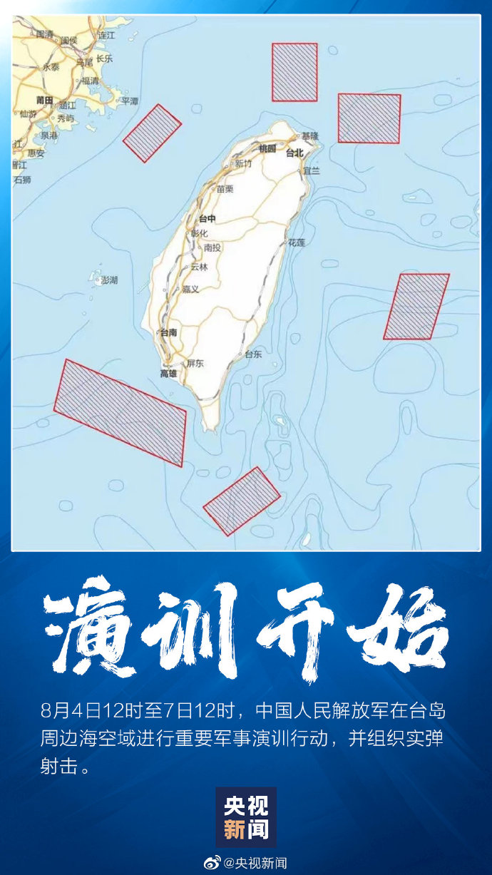今日12時(shí)至7日12時(shí),解放軍重要軍事演訓(xùn)行動進(jìn)行,并組織實(shí)彈射擊。此次實(shí)戰(zhàn)演訓(xùn)選擇環(huán)島六大區(qū)域,在此期間,有關(guān)船只和飛行器不要進(jìn)入有關(guān)海域和空域!