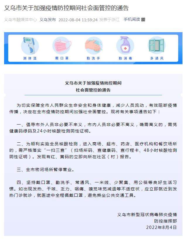 中新網(wǎng)8月4日電 據(jù)“義烏發(fā)布”微信公眾號消息,浙江省義烏市新型冠狀病毒肺炎疫情防控指揮部4日發(fā)布義烏市關(guān)于加強疫情防控期間社會面管控的通告。通告指出,為切實保障全市人民群眾生命安全和身體健康,減少人員流動,有效阻斷疫情傳播,決定在全市疫情防控期間加強社會面管控。