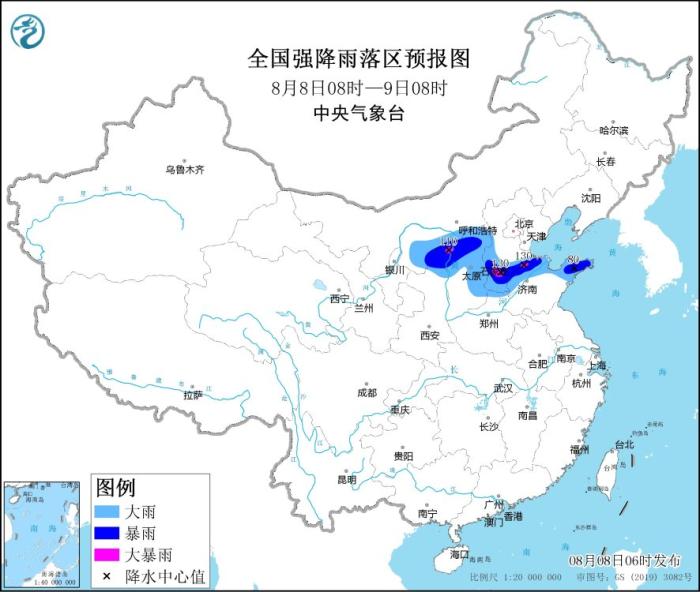 8月8日08時(shí)至9日08時(shí),內(nèi)蒙古河套地區(qū)、陜西北部、山西北部和東部、河北中南部、山東北部等地的部分地區(qū)有大到暴雨,其中,陜西北部、河北南部、山東西北部等地局地有大暴雨(100~130毫米)。內(nèi)蒙古中東部、遼東半島、山東半島等地部分地區(qū)有4~5級(jí)風(fēng)。
