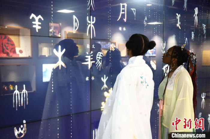 外國(guó)留學(xué)生通過(guò)觸摸電子屏幕體驗(yàn)學(xué)習(xí)漢字文化、了解漢字的演變歷程?!∷逑?攝