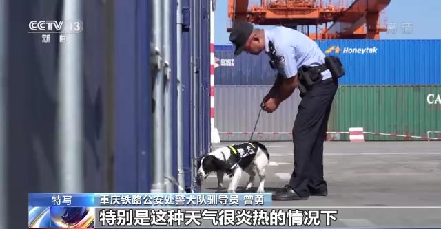 重慶鐵路公安處警犬隊馴導員 陳城:咱們警犬它散熱的方式就是通過舌頭,但是它工作的時候又要閉著嘴,用鼻子來呼吸、工作。天氣又太熱,它自身也非常難受,其實它內(nèi)心是非常煎熬的,但是咱們的警犬都非常棒,執(zhí)行命令也非常強。