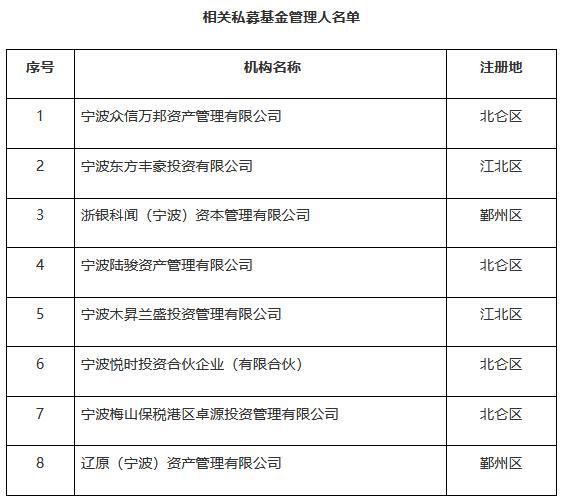 中新網(wǎng)8月17日電 寧波證監(jiān)局16日發(fā)布關(guān)于要求相關(guān)私募基金管理人的有關(guān)負責人到寧波證監(jiān)局接受監(jiān)管約談的通知。通知顯示,寧波證監(jiān)局2022年3月30日印發(fā)《關(guān)于開展轄區(qū)私募基金管理人2022年自查工作的通知》(甬證監(jiān)發(fā)〔2022〕12號),并于2022年6月6日發(fā)布《關(guān)于寧波轄區(qū)2022年逾期未完成自查工作的私募機構(gòu)專項通報(第一批)》,截至2022年8月16日,以下8家機構(gòu)仍未按要求完成相關(guān)工作。