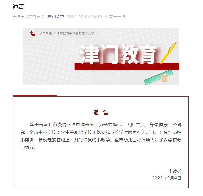 中新網(wǎng)9月5日電 天津市教育委員會4日晚在其官方微信發(fā)布通告稱,鑒于當(dāng)前天津市疫情防控總體形勢,為全力確保廣大師生員工身體健康,經(jīng)研究,全市中小學(xué)校(含中等職業(yè)學(xué)校)恢復(fù)線下教學(xué)時間再推遲幾日。在疫情防控形勢進(jìn)一步穩(wěn)定的基礎(chǔ)上,及時恢復(fù)線下教學(xué)。全市幼兒園和外籍人員子女學(xué)校參照執(zhí)行。