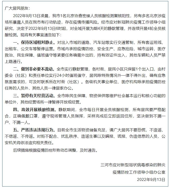 河北省三河市應(yīng)對新型冠狀病毒感染的肺炎疫情防控工作領(lǐng)導(dǎo)小組辦公室9月13日發(fā)布通告,決定于2022年9月13日6時起,對全域開展為期4天的靜默管理,并連續(xù)開展4輪全員核酸檢測。通告全文如下: