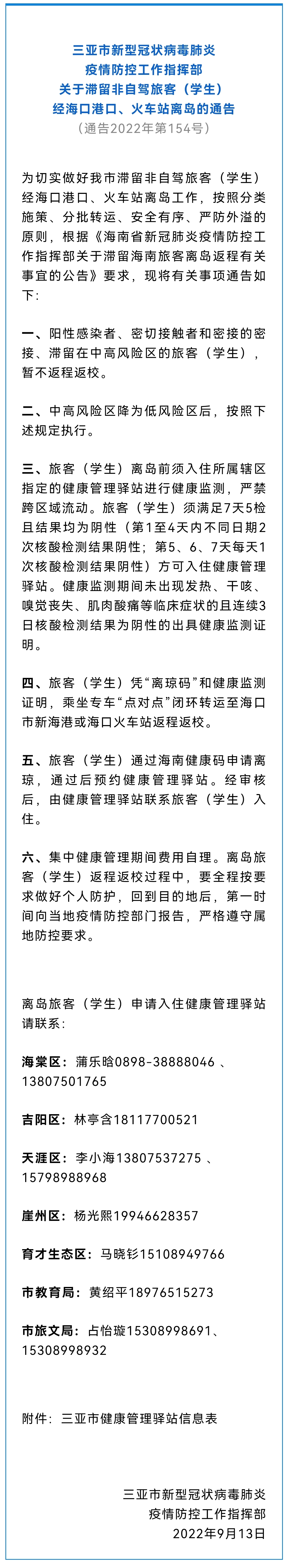 9月13日,總臺記者從三亞市新型冠狀病毒肺炎疫情防控工作指揮部獲悉,為切實做好三亞市滯留非自駕旅客(學生)經(jīng)??诟劭凇⒒疖囌倦x島工作,按照分類施策、分批轉運、安全有序、嚴防外溢的原則,根據(jù)《海南省新冠肺炎疫情防控工作指揮部關于滯留海南旅客離島返程有關事宜的公告》要求,現(xiàn)將有關事項通告如下: