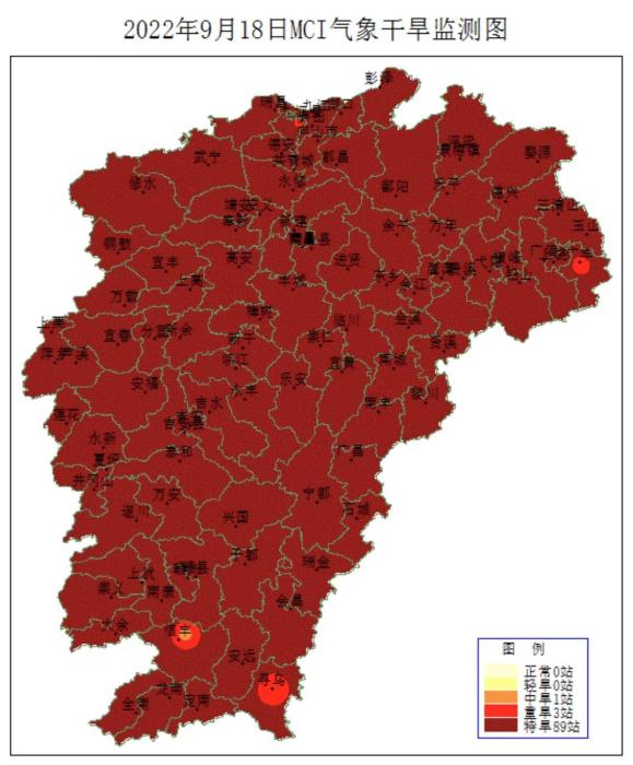 今天(19日),江西高溫持續(xù),由于無(wú)有效降雨,全省95.7%的縣(市、區(qū))出現(xiàn)特重氣象干旱。7月12日江西局部開(kāi)始出現(xiàn)重度氣象干旱以來(lái)至今已持續(xù)69天,森林火險(xiǎn)氣象等級(jí)4(高)至5級(jí)(極高)。