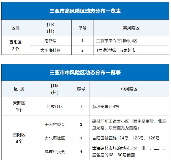 9月19日,記者從海南省三亞市新型冠狀病毒肺炎疫情防控工作指揮部獲悉,根據(jù)當(dāng)前三亞市疫情防控工作需要,按照國務(wù)院應(yīng)對新型冠狀病毒肺炎疫情聯(lián)防聯(lián)控機(jī)制綜合組《新型冠狀病毒肺炎防控方案(第九版)》相關(guān)規(guī)定,經(jīng)專家組研判,三亞市疫情防控指揮部決定,將紅旗街社區(qū)椰風(fēng)巷79、81、83號樓等區(qū)域調(diào)整為低風(fēng)險(xiǎn)區(qū),自通告發(fā)布起,高風(fēng)險(xiǎn)區(qū)調(diào)整為2個(gè)、中風(fēng)險(xiǎn)區(qū)調(diào)整為4個(gè)(見附表)。除高、中風(fēng)險(xiǎn)區(qū)外的區(qū)域?yàn)榈惋L(fēng)險(xiǎn)區(qū)。