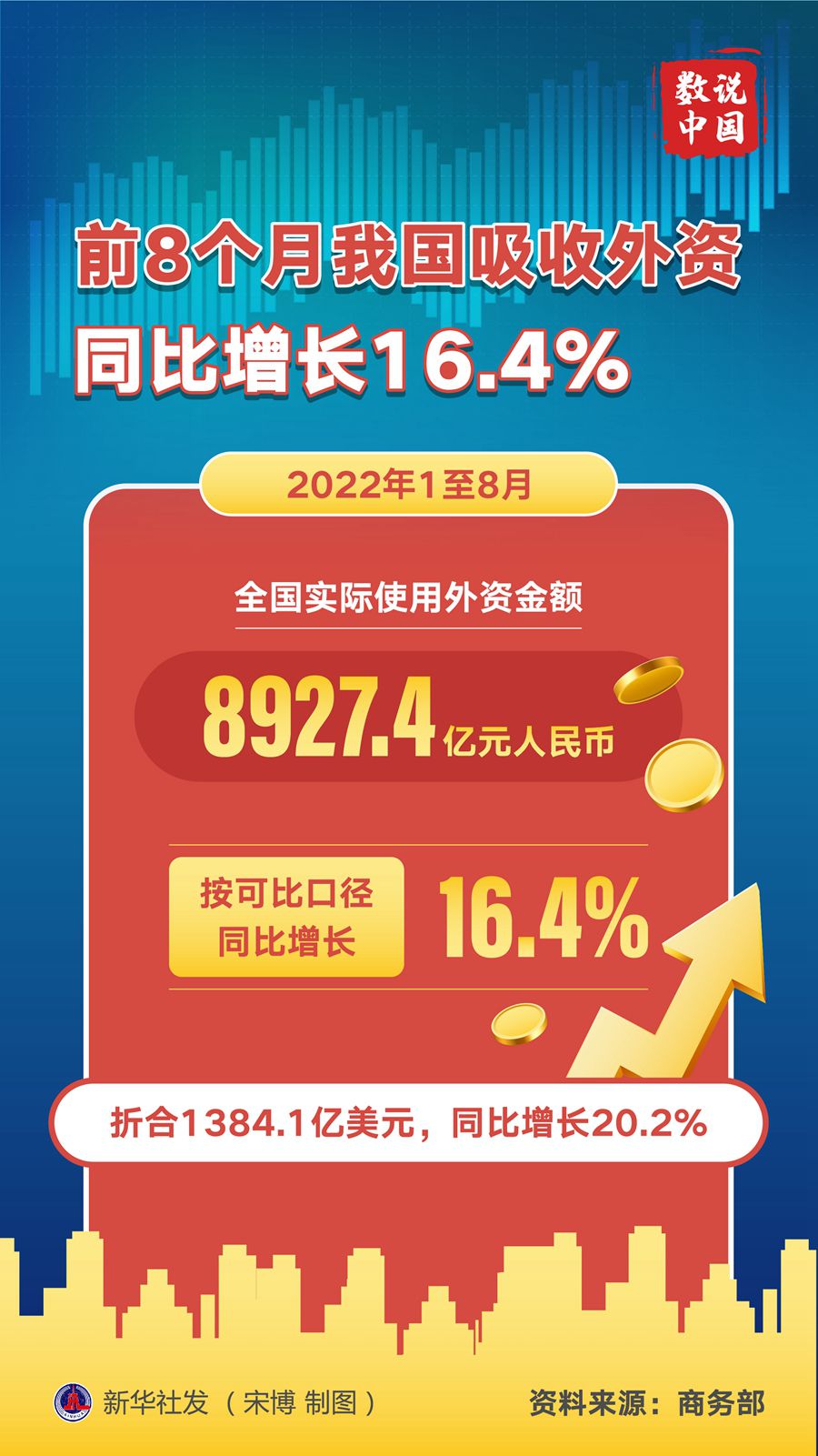 新華社北京9月19日電 (記者 謝?,?記者19日從商務(wù)部獲悉,2022年1至8月,全國實(shí)際使用外資金額8927.4億元人民幣,按可比口徑同比增長16.4%(下同),折合1384.1億美元,同比增長20.2%。