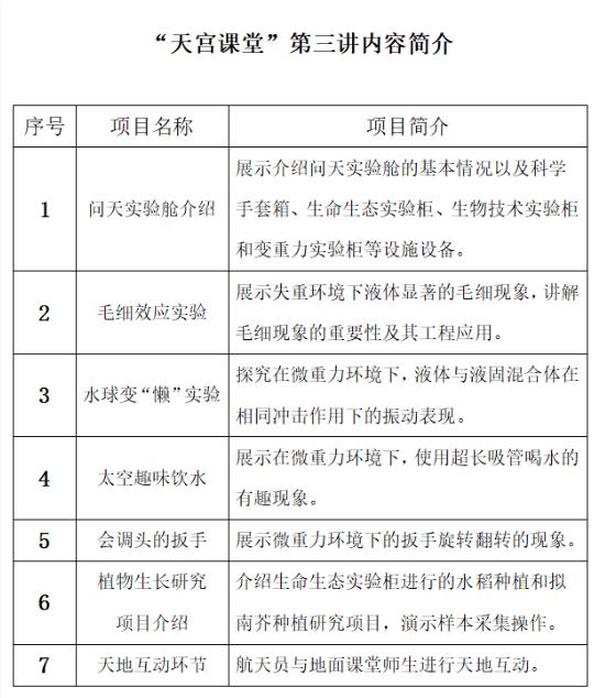 本次太空授課活動(dòng)將繼續(xù)采取天地互動(dòng)方式進(jìn)行,3名航天員將在軌介紹展示中國(guó)空間站問(wèn)天實(shí)驗(yàn)艙工作生活場(chǎng)景,演示微重力環(huán)境下毛細(xì)效應(yīng)實(shí)驗(yàn)、水球變“懶”實(shí)驗(yàn)、太空趣味飲水、會(huì)調(diào)頭的扳手以及植物生長(zhǎng)研究項(xiàng)目介紹,并與地面課堂進(jìn)行互動(dòng)交流,旨在傳播普及載人航天知識(shí),激發(fā)廣大青少年對(duì)科學(xué)的興趣。