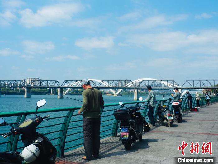 入秋,碧水藍(lán)天相互映襯,廣西柳州市的市民在柳江河的河岸上釣魚休閑。 李嬌陽 攝