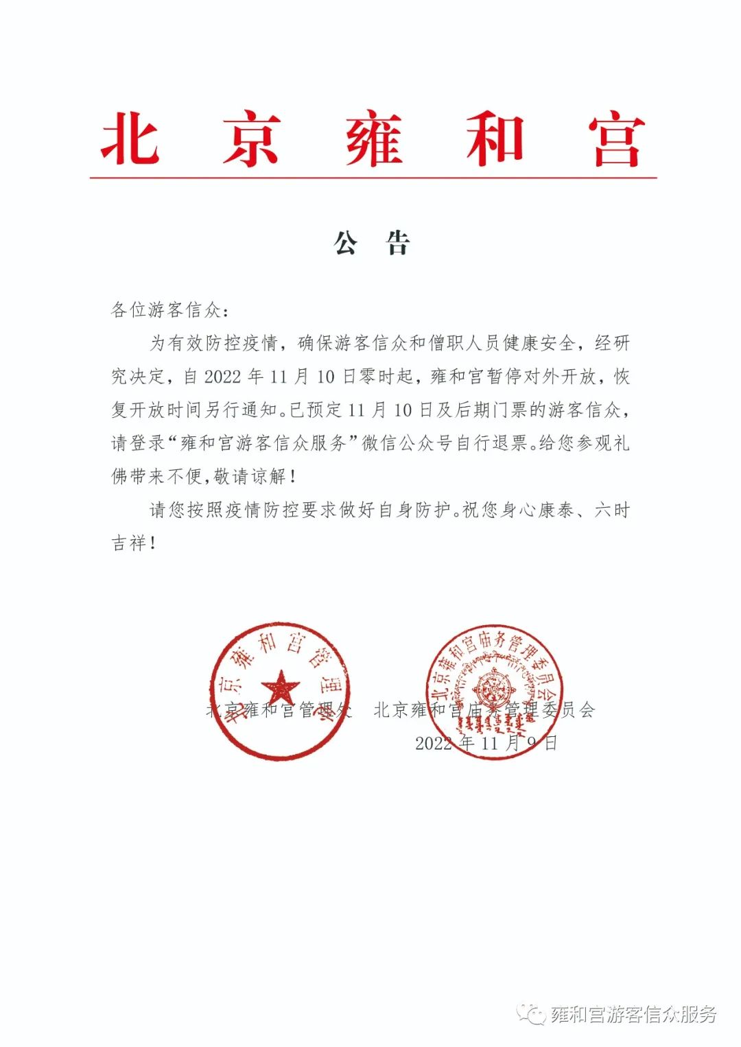 中新網(wǎng)11月9日電 據(jù)雍和宮游客信眾服務(wù)微信公眾號消息,為有效防控疫情,確保游客信眾和僧職人員健康安全,經(jīng)研究決定,自2022年11月10日零時(shí)起,雍和宮暫停對外開放,恢復(fù)開放時(shí)間另行通知。已預(yù)定11月10日及后期門票的游客信眾,請登錄“雍和宮游客信眾服務(wù)”微信公眾號自行退票。