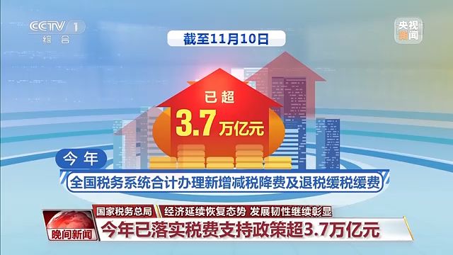 國(guó)家稅務(wù)總局今天公布最新數(shù)據(jù),截至11月10日,今年全國(guó)稅務(wù)系統(tǒng)合計(jì)辦理新增減稅降費(fèi)及退稅緩稅緩費(fèi)已超3.7萬億元,各項(xiàng)稅費(fèi)支持政策有效減輕了企業(yè)負(fù)擔(dān),增強(qiáng)了企業(yè)發(fā)展動(dòng)能。