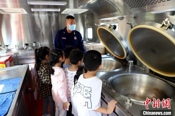 消防員帶領(lǐng)小朋友們參觀炊事車。 蔡增欣 攝