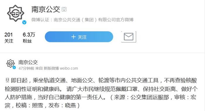 中新網(wǎng)12月5日電 據(jù)南京公共交通(集團)有限公司官方微博消息,即日(5日)起,乘坐軌道交通、地面公交、輪渡等市內公共交通工具,不再查驗核酸檢測陰性證明和健康碼。