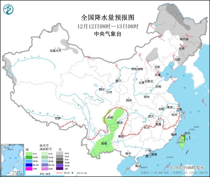 圖3 全國降水量預報圖(12月12日08時-13日08時)