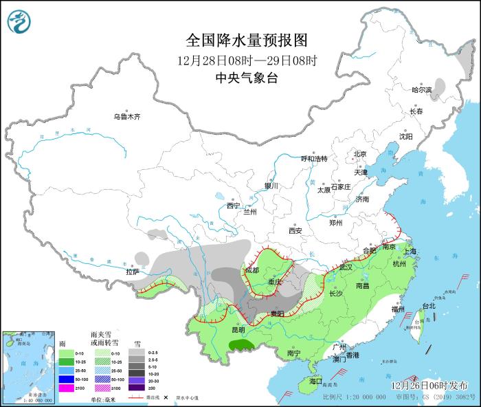 12月28日08時(shí)至29日08時(shí),黑龍江東部、西藏東部和南部、湖北南部、川西高原、重慶東南部、貴州大部、湖南西部、云南北部以及安徽大別山區(qū)等地部分地區(qū)有小到中雪或雨夾雪。江淮南部、江南大部、西南地區(qū)東南部、華南大部等地部分地區(qū)有小到中雨。內(nèi)蒙古中部、河北北部部分地區(qū)有4~5級(jí)風(fēng)。東海南部海域、臺(tái)灣海峽、巴士海峽、南海大部海域、北部灣將有6~7級(jí)、陣風(fēng)8級(jí)的偏北或東北風(fēng),其中臺(tái)灣海峽、南海東北部的部分海域風(fēng)力可達(dá)8級(jí)、陣風(fēng)9級(jí)(見(jiàn)圖3)。