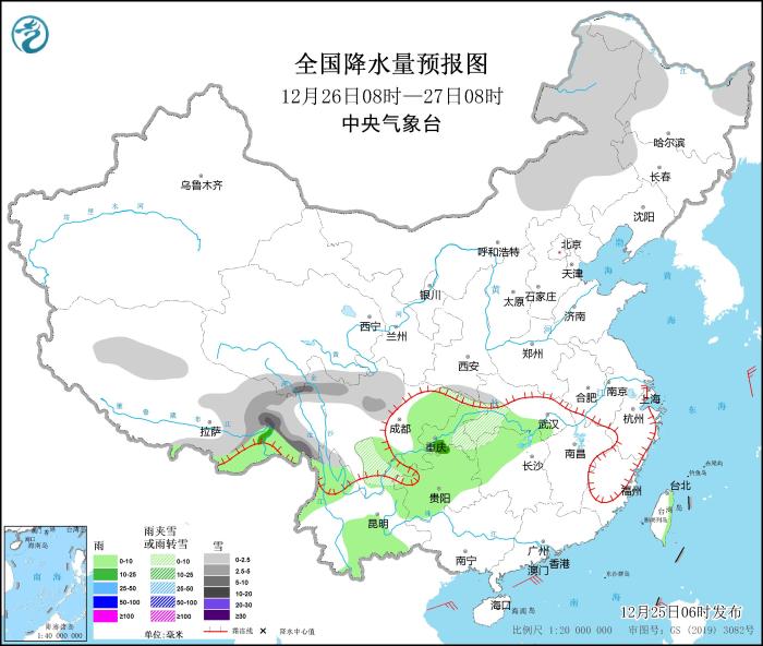 12月26日08時至27日08時,內(nèi)蒙古東部、黑龍江西部和東北部、西藏北部和東部、川西高原北部、湖北西部等地部分地區(qū)有小到中雪或雨夾雪,其中,西藏東南部等地部分地區(qū)有大到暴雪。西藏東南部、湖南北部和西部、西南地區(qū)東部、云南西部和東南部等地部分地區(qū)有小雨,其中,西藏東南部、重慶西部、貴州東北部等地部分地區(qū)有中雨。臺灣海峽、巴士海峽、南海大部海域、北部灣將有6~7級、陣風(fēng)8級的東北風(fēng)。