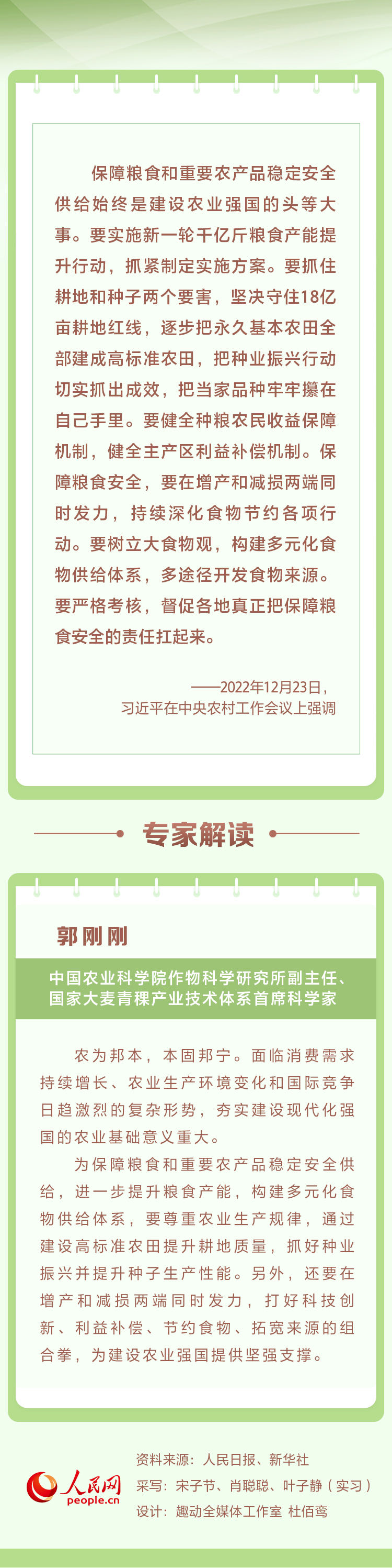 12月23日至24日,中央農(nóng)村工作會議在北京舉行。中共中央總書記、國家主席、中央軍委主席習(xí)近平出席會議并發(fā)表重要講話。人民網(wǎng)帶您重溫講話要點并邀請專家進(jìn)行解讀。本期聚焦“保障糧食和重要農(nóng)產(chǎn)品穩(wěn)定安全供給始終是建設(shè)農(nóng)業(yè)強國的頭等大事”。