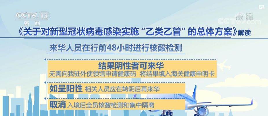 按照《總體方案》要求,來華人員在行前48小時進行核酸檢測,結(jié)果陰性者可來華,無需向我駐外使領(lǐng)館申請健康碼,將結(jié)果填入海關(guān)健康申明卡。如呈陽性,相關(guān)人員應(yīng)在轉(zhuǎn)陰后再來華;取消入境后全員核酸檢測和集中隔離。健康申報正常且海關(guān)口岸常規(guī)檢疫無異常者,可放行進入社會面;取消“五個一”及客座率限制等國際客運航班數(shù)量管控措施;各航空公司繼續(xù)做好機上防疫,乘客乘機時須佩戴口罩;進一步優(yōu)化復(fù)工復(fù)產(chǎn)、商務(wù)、留學(xué)、探親、團聚等外籍人士來華安排,提供相應(yīng)簽證便利。逐步恢復(fù)水路、陸路口岸客運出入境。根據(jù)國際疫情形勢和各方面服務(wù)保障能力,有序恢復(fù)中國公民出境旅游。
