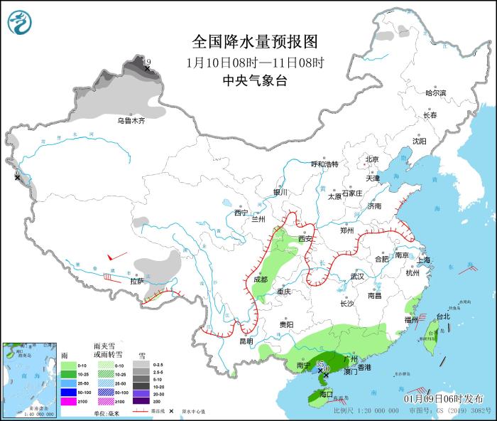 1月9日08時(shí)至10日08時(shí),新疆北部和西部山區(qū)、西藏西部等地部分地區(qū)有小到中雪,其中,新疆北疆北部、西藏西部局地有大到暴雪(10~18毫米)。江南中南部、華南大部、臺灣島等地部分地區(qū)有小到中雨,其中,廣東東北部和西南部沿海、海南島北部等地局地有大雨(25~45毫米)。西藏中西部等地部分地區(qū)有5~7級風(fēng)(見圖1)。