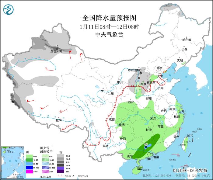 1月11日08時(shí)至12日08時(shí),黑龍江西北部、新疆北部和西部、陜西北部、山西等地部分地區(qū)有小到中雪或雨夾雪,其中,新疆沿天山地區(qū)、西藏西部等地部分地區(qū)有大到暴雪(10~18毫米)。西北地區(qū)東南部、河南南部、江漢、江南大部、西南地區(qū)東部、華南、臺灣島等地部分地區(qū)有小到中雨,局地有大雨(25~40毫米)。新疆南疆盆地、西藏等地部分地區(qū)有4~6級風(fēng),其中,西藏北部和西部等地部分地區(qū)有7~8級風(fēng),新疆東部部分地區(qū)有8~9級風(fēng)(見圖3)。