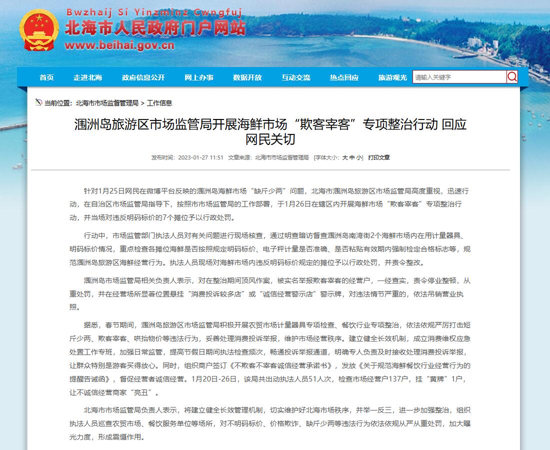 中新網(wǎng)1月28日電 據(jù)北海市市場監(jiān)督管理局網(wǎng)站27日消息,針對(duì)1月25日網(wǎng)民在微博平臺(tái)反映的潿洲島海鮮市場“缺斤少兩”問題,北海市潿洲島旅游區(qū)市場監(jiān)管局高度重視,迅速行動(dòng),在自治區(qū)市場監(jiān)管局指導(dǎo)下,按照市市場監(jiān)管局的工作部署,于1月26日在轄區(qū)內(nèi)開展海鮮市場“欺客宰客”專項(xiàng)整治行動(dòng),并當(dāng)場對(duì)違反明碼標(biāo)價(jià)的7個(gè)攤位予以行政處罰。