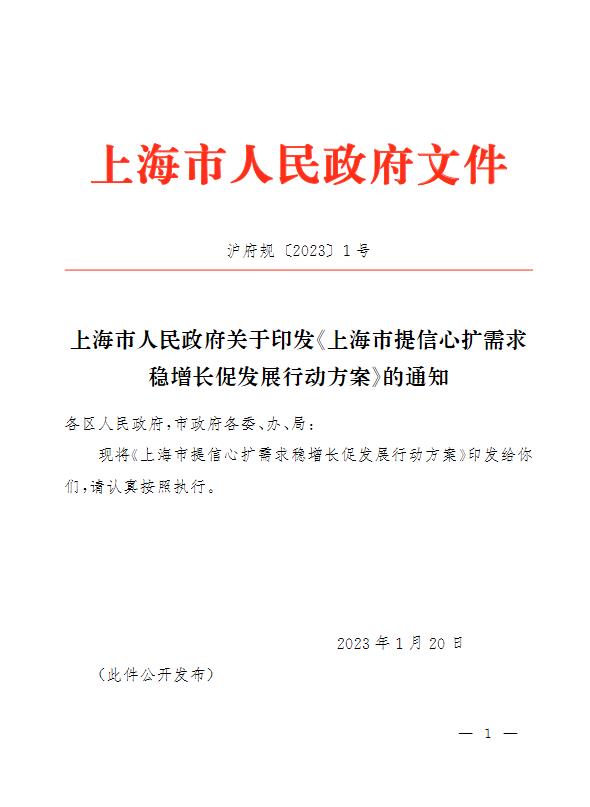 中新網(wǎng)1月29日電 據(jù)上海發(fā)布微信公眾號29日消息,為全面貫徹黨的二十大和中央經(jīng)濟工作會議精神,落實市第十二次黨代會和十二屆市委二次全會部署,抓牢高質(zhì)量發(fā)展首要任務(wù),大力提振市場預期和信心,推動經(jīng)濟社會發(fā)展開好局起好步,近期上海市制定了《上海市提信心擴需求穩(wěn)增長促發(fā)展行動方案》(以下簡稱《行動方案》)。