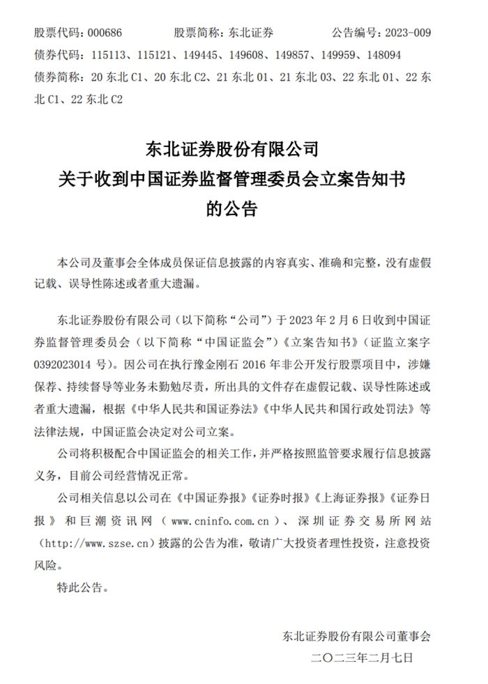 東北證券:中國證監(jiān)會(huì)決定對(duì)公司立案