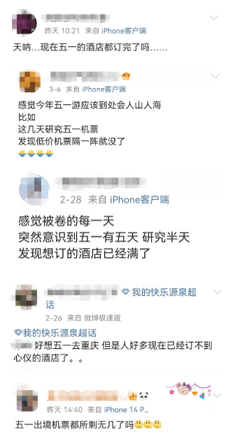 社交平臺上,多名網(wǎng)友早已規(guī)劃好了自己“五一”出行的計劃,并已提前購買機(jī)票和酒店,面對緊俏的旅游產(chǎn)品,有網(wǎng)友驚呼:“現(xiàn)在就已經(jīng)訂不到房了嗎?”“低價機(jī)票隔一會兒就沒了!”