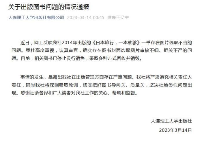 中新網(wǎng)3月14日電 據(jù)大連理工大學出版社有限公司官方微信消息,大連理工大學出版社14日發(fā)布情況通報稱,近日,網(wǎng)上反映大連理工大學出版社2014年出版的《日本旅行,一本就夠》一書存在圖片選取不當?shù)膯栴}。該社高度重視,認真審查,確實存在圖書封面選取圖片審核不細、把關(guān)不嚴的問題。目前,相關(guān)圖書已停止發(fā)行銷售,采取多種方式回收并銷毀。