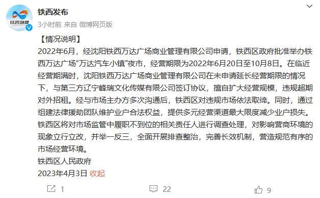 中新網(wǎng)4月3日電 鐵西發(fā)布官方微博3日發(fā)布情況說明:2022年6月,經(jīng)沈陽(yáng)鐵西萬達(dá)廣場(chǎng)商業(yè)管理有限公司申請(qǐng),鐵西區(qū)政府批準(zhǔn)舉辦鐵西萬達(dá)廣場(chǎng)“萬達(dá)汽車小鎮(zhèn)”夜市,經(jīng)營(yíng)期限為2022年6月20日至10月8日。在臨近經(jīng)營(yíng)期滿時(shí),沈陽(yáng)鐵西萬達(dá)廣場(chǎng)商業(yè)管理有限公司在未申請(qǐng)延長(zhǎng)經(jīng)營(yíng)期限的情況下,與第三方遼寧峰瑞文化傳媒有限公司簽訂協(xié)議,擅自擴(kuò)大經(jīng)營(yíng)規(guī)模,違規(guī)超期對(duì)外招租。