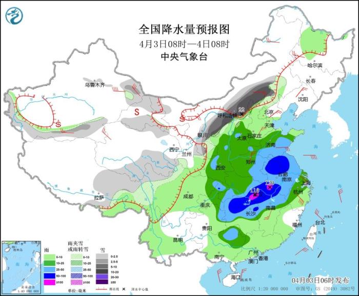 4月3日至4日,我國(guó)中東部地區(qū)有一次大范圍降水天氣過(guò)程,西北地區(qū)東部、西南地區(qū)東部、黃淮、江淮、江漢、江南、華南等地有中到大雨,部分地區(qū)有暴雨,局地有大暴雨;甘肅東部、寧夏、內(nèi)蒙古中東部等地有中到大雪或雨夾雪,內(nèi)蒙古中部等地局地暴雪或大暴雪。其中,4月3日08時(shí)至4日08時(shí),湖北東部和南部、湖南北部、江西北部、安徽、河南東部、山東南部、江蘇及陜西中部、山西中部、重慶北部、廣西東北部等地有大到暴雨,其中,安徽西南部、湖北東部、湖南北部等地部分地區(qū)有大暴雨(100~130毫米)。上述部分地區(qū)伴有短時(shí)強(qiáng)降水(最大小時(shí)降雨量20~50毫米,局地可超過(guò)60毫米),局地有雷暴大風(fēng)、冰雹等強(qiáng)對(duì)流天氣。內(nèi)蒙古中部的部分地區(qū)有大到暴雪,局地大暴雪(見(jiàn)圖2)。中央氣象臺(tái)4月3日06時(shí)繼續(xù)發(fā)布暴雨藍(lán)色預(yù)警和強(qiáng)對(duì)流天氣藍(lán)色預(yù)警。