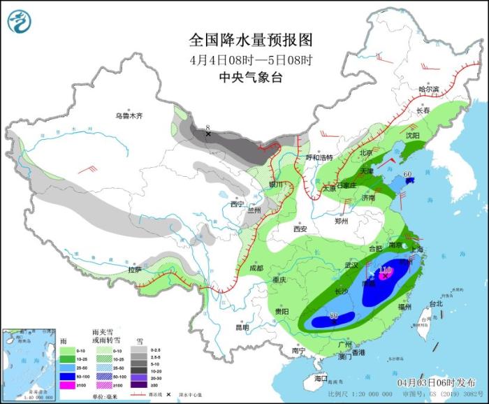 4月3日08時(shí)至4日08時(shí),新疆南疆盆地和東部、西藏東部、西北地區(qū)中部和東北部、內(nèi)蒙古中部、川西高原北部、陜西北部、山西北部、河北北部等地部分地區(qū)有小到中雪或雨夾雪,其中,內(nèi)蒙古中部、河北西北部等地部分地區(qū)有大到暴雪,局地大暴雪(20~22毫米)。湖北東部和南部、湖南北部、江西北部、安徽、河南東部、山東南部、江蘇及陜西中部、山西中部、重慶北部、廣西東北部等地有大到暴雨,其中,安徽西南部、湖北東部、湖南北部等地部分地區(qū)有大暴雨(100~130毫米)。內(nèi)蒙古、東北地區(qū)西部、新疆南部、華北、黃淮、江淮等地部分地區(qū)有4~6級(jí)風(fēng),局部有6~7級(jí)風(fēng)(見(jiàn)圖3)。渤海、黃海西南部、東海西北部、長(zhǎng)江口附近海域?qū)⒂?級(jí)、陣風(fēng)9級(jí)的大風(fēng),其中渤海灣將有9級(jí)、陣風(fēng)10級(jí)的大風(fēng)。