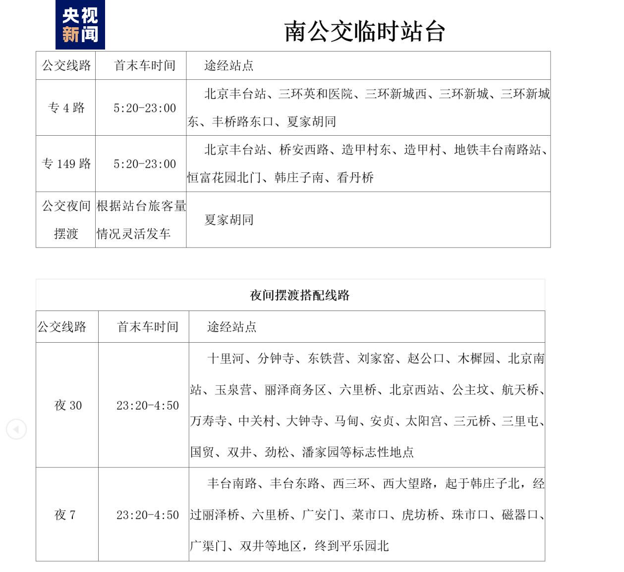 0時(shí)至5時(shí),北京豐臺(tái)站,在出租車調(diào)度站及南廣場(chǎng)臨時(shí)公交站臺(tái)區(qū)域設(shè)有免費(fèi)擺渡車幫助旅客離站,共計(jì)兩個(gè)方向,具體如下: