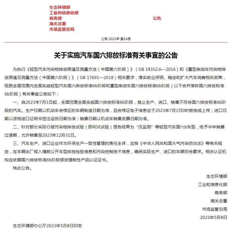 其中要求,自2023年7月1日起,全國范圍全面實(shí)施國六排放標(biāo)準(zhǔn)6b階段,禁止生產(chǎn)、進(jìn)口、銷售不符合國六排放標(biāo)準(zhǔn)6b階段的汽車。生產(chǎn)日期以機(jī)動車合格證的車輛制造日期為準(zhǔn),且合格證電子信息應(yīng)于2023年7月1日0時(shí)前完成上傳;進(jìn)口日期以貨物進(jìn)口證明書簽注運(yùn)抵日期為準(zhǔn);銷售日期以機(jī)動車銷售發(fā)票日期為準(zhǔn)。