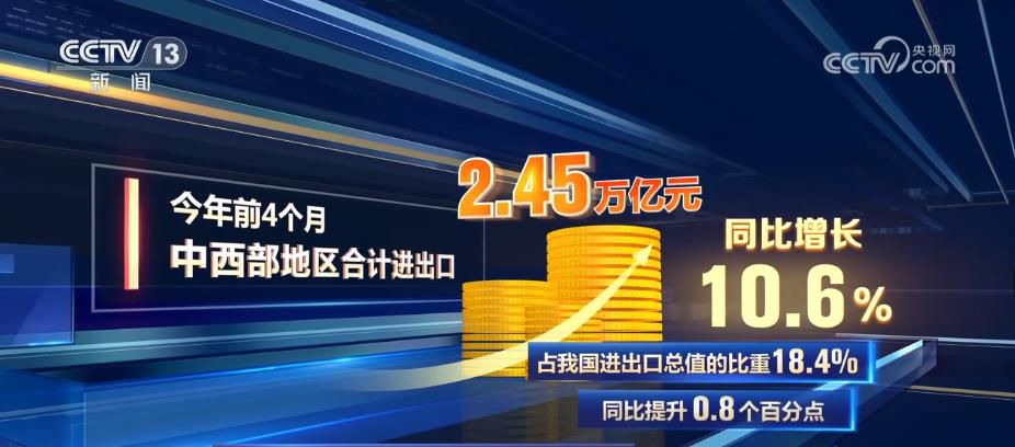 央視網消息:從我國外貿區(qū)域結構來看,今年前4個月,中西部地區(qū)合計進出口2.45萬億元,同比增長10.6%,占我國進出口總值的比重18.4%,同比提升0.8個百分點。我國中西部地區(qū)進出口快速增長,增速高出全國4.8個百分點。