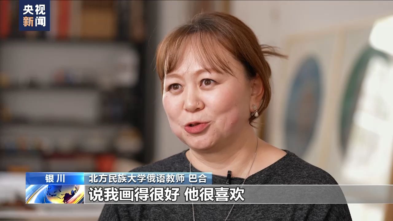 北方民族大學俄語教師 巴合:我丈夫看了我的畫,說我畫得很好,他很喜歡。從那以后,我就開始了我的藝術之旅。